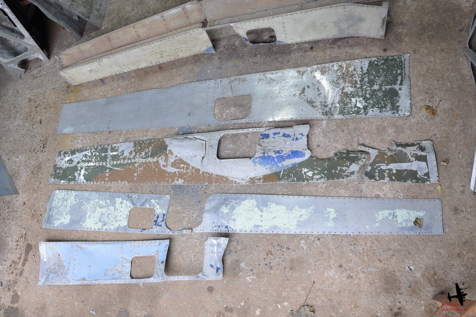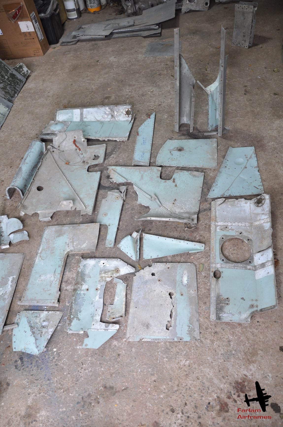 There are at least 4 aircraft in the collection. The majority of the parts are made by Gloster or by Canadian Car Foundry. There are part numbers and original paint including roundel sections. A few panel which are mainly from the under carriage are Russian lend lease due to the very distinct Russian paint color.